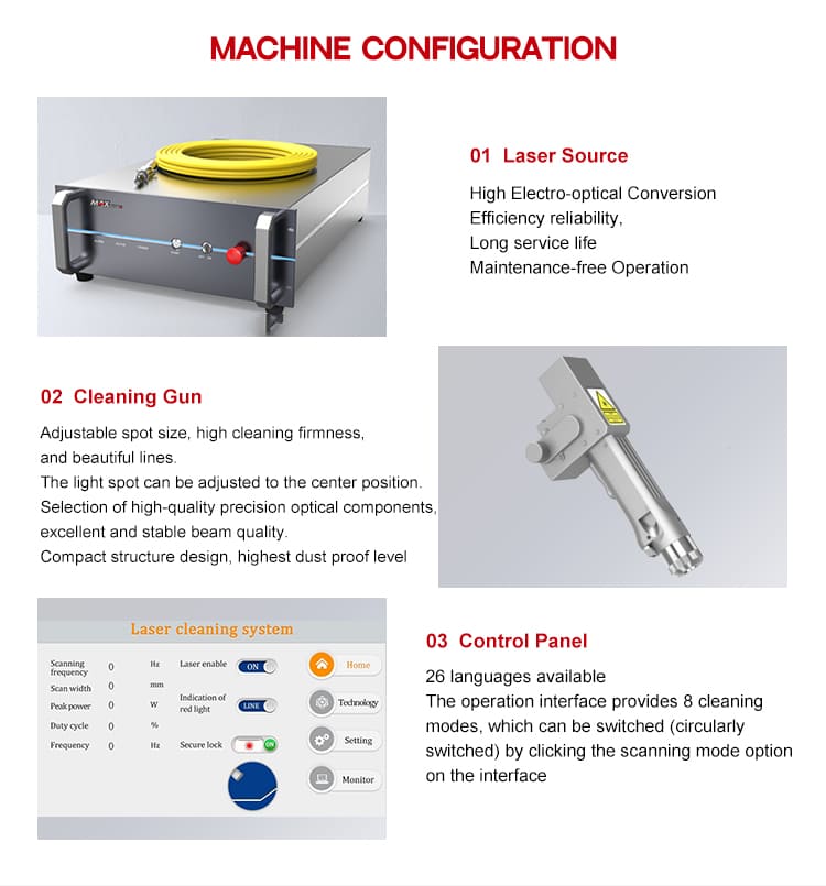 Essendo una macchina per la pulizia laser senza contatto, non danneggia il substrato delle parti, non consente risparmio energetico dei materiali di consumo e protezione ambientale e può rimuovere in modo efficiente resina, olio, macchie, sporco/ruggine, rivestimento, rivestimento e vernice dalla superficie del pezzo per soddisfare i requisiti di pulizia sulla modellazione complessa e sul posizionamento fine nel campo della lavorazione industriale, ottenere un grado di pulizia più elevato dell'effetto pulente e i vantaggi della produzione a un costo complessivo inferiore.